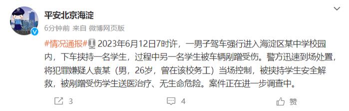 北京海淀警方:夫君驾车突入某中学校园挟制门生,门生已得救 ...