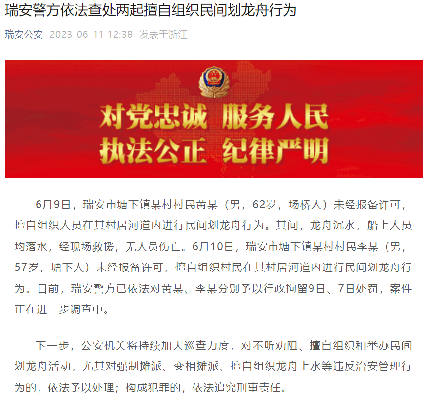 原标题:两村民私自构造民间划龙舟运动,警方:已拘留 据瑞安公安公众号6月11日消息:6月9日,瑞安市塘下镇某村村民黄某(男,62岁 ...