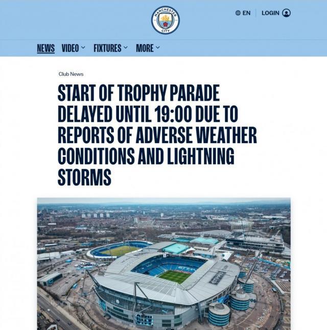 曼城官方:由于雷暴等恶劣气候,夺冠游行推迟至19:00 ...