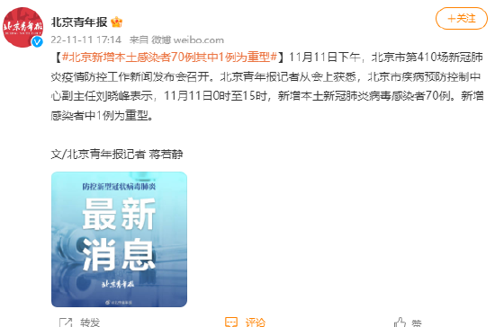 [#北京新增本土感染者70例此中1例为重型#]11月11日下战书,北京市第410场新冠肺炎疫情防控工作消息发布会召开。北京青年报记者从会上获悉,北京市疾病 ...