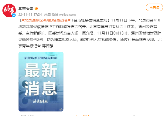 [#北京通州区新增3名感染者# 1名为社碰面筛查发现]11月11日下战书,北京市第410场新冠肺炎疫情防控工作消息发布会召开。北京青年报记者从会上获悉,通 ...