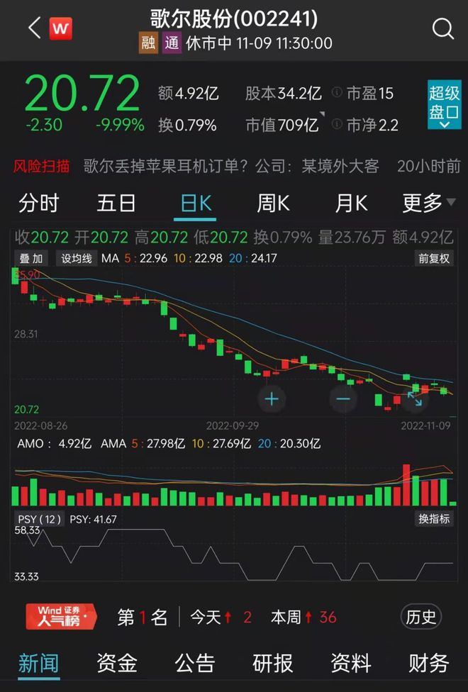 市值700亿元的“果链”龙头歌尔股份遭遇利空。11月9日早盘,歌尔股份跌停。泉源:Wind11月8日晚间,歌尔股份发布公告称,公司克日收到境外某大客户的关照,停息 ...