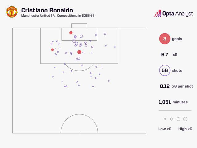 C罗本赛季1051分钟进场时间56次射门打进3球,预期进球值6.7 ...