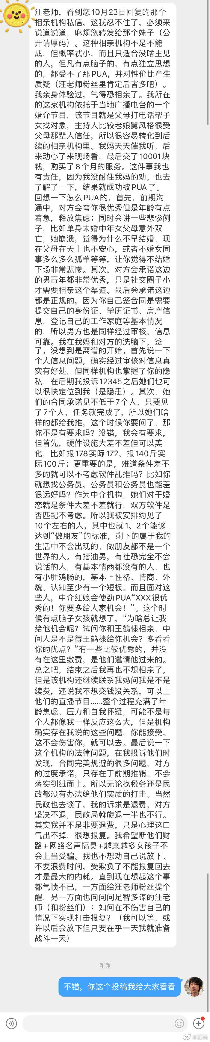 @汪有:一位女青年,看了前次咨询我相亲机构那位女青年的遭遇。她就来 helps girls,分享了一段她本身被相亲机构坑的履历。总结就是如今挣钱都不轻易,被他们骗 ...