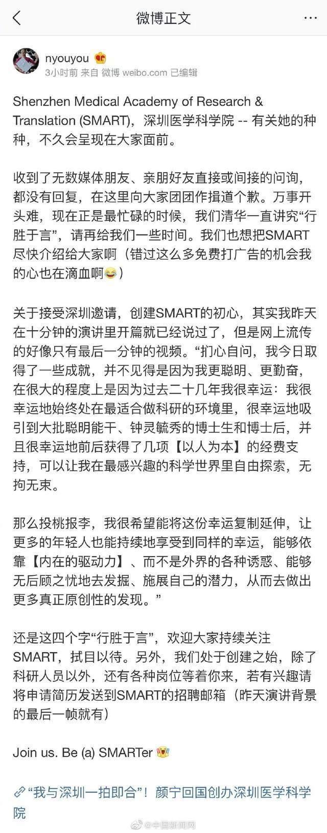 11 月 1 日,闻名科学家颜宁公布,将辞去普林斯顿大学教职,到深圳建立医学科学院,引发网友关注。2 日,颜宁 @nyouyou 在微博平台发文对此举行回应。据知恋人士 ...