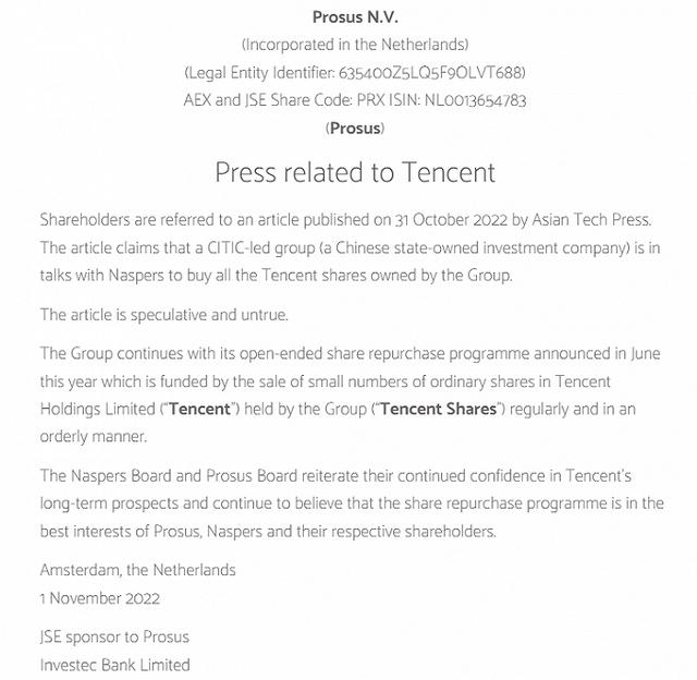 【腾讯大股东 Prosus:有关中信组团收购腾讯股份的消息不实 对腾讯的恒久远景仍有信心】财联社 11 月 1 日电,腾讯最大股东、南非 Naspers 团体荷兰子公司 Prosu ...