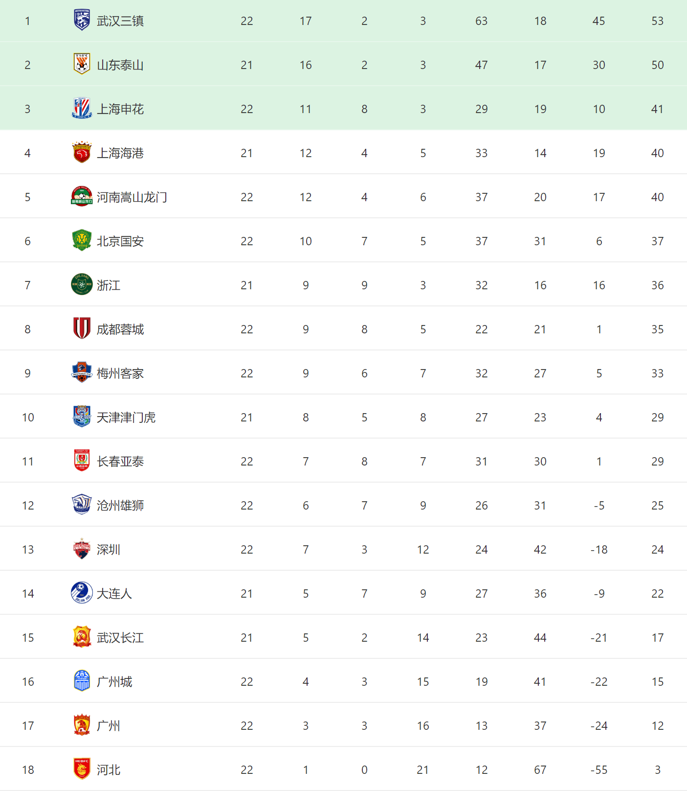 积分榜:三镇多赛1场领先泰山3分 广州城反超广州队