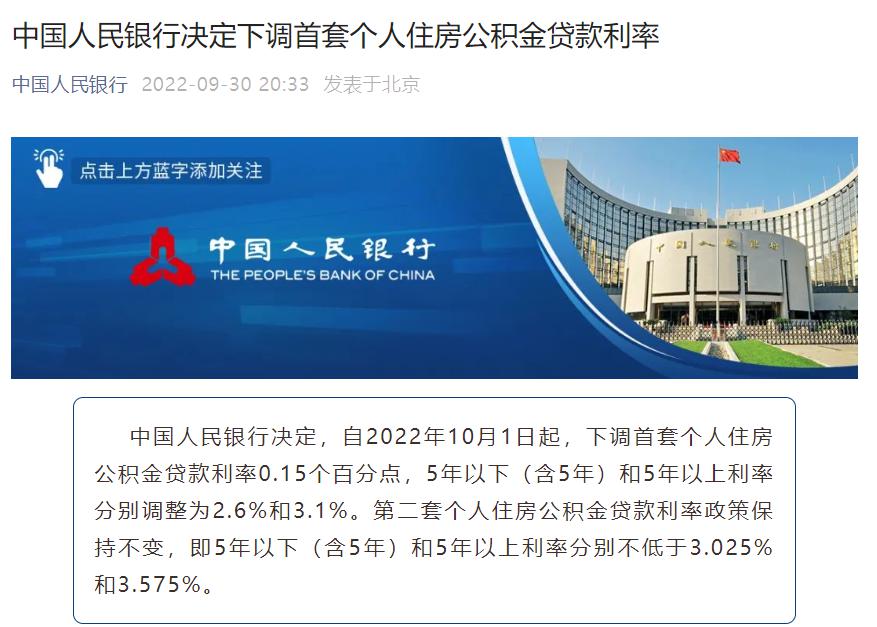 乐居新媒体珠海讯 9 月 30 日晚,央行发布一则公告,此中提到,中国人民银行决定,自 2022 年 10 月 1 日起,下调首套个人住房公积金贷款利率 0.15 个百分点,5 ...